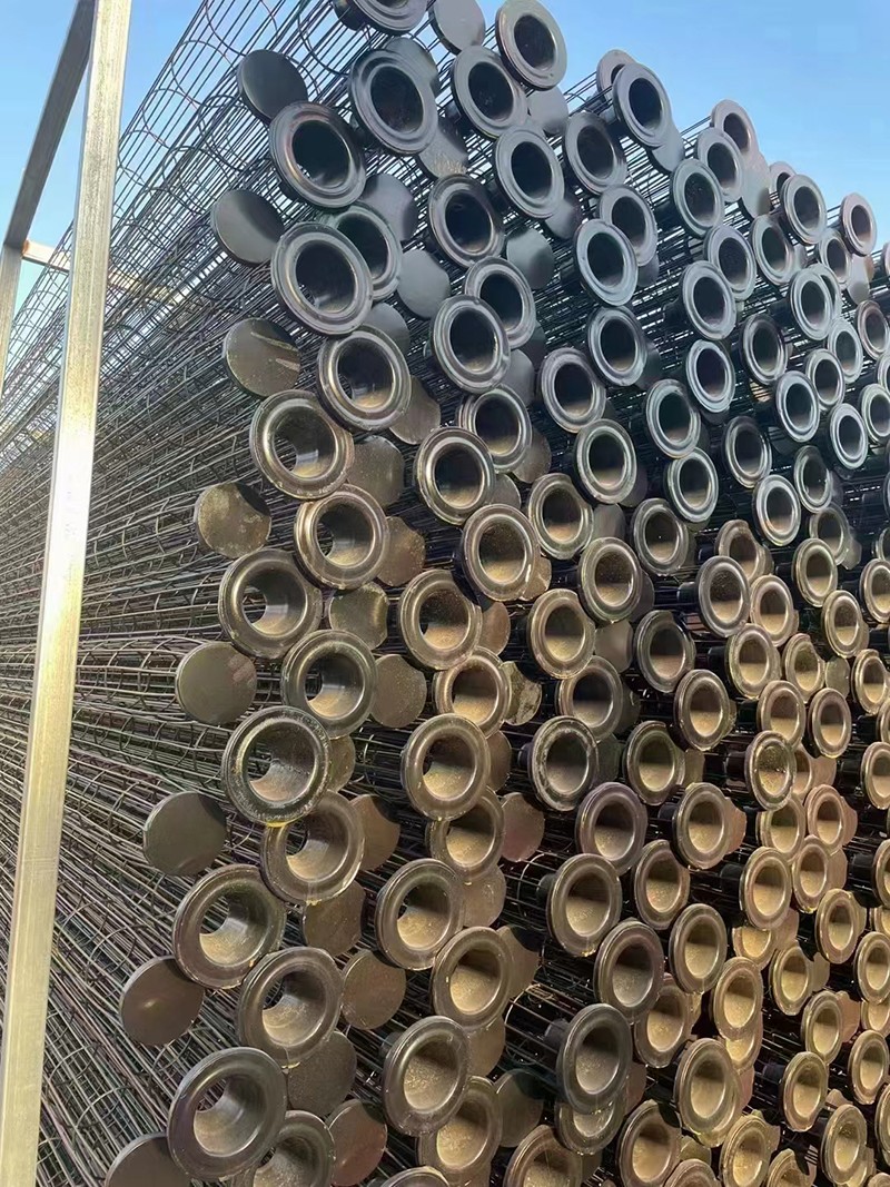 除塵布袋骨架是采用直徑為3-4個的碳鋼絲或不銹鋼絲為原材料,由縱筋和支撐環(huán)縱橫疊交焊接成的籠形件。除塵布袋骨架安裝在脈沖除塵器和氣箱式脈沖除塵器中的花板孔上,用來支撐除塵濾袋防止塌陷,有助于粉塵的清除和提供除塵效率。粉塵是附著在除塵濾袋的外表面,含塵氣體經過除塵器時,粉塵被捕集在濾袋的外表面,而干凈氣體通過濾料進入濾袋內部后經風機排出。